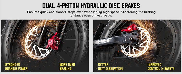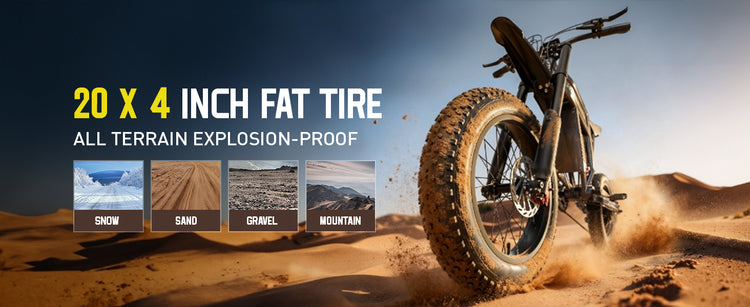 20x4.0 inch wide fat tires provide excellent stability, traction, and shock absorption on sand, snow, mud, and rocky paths.