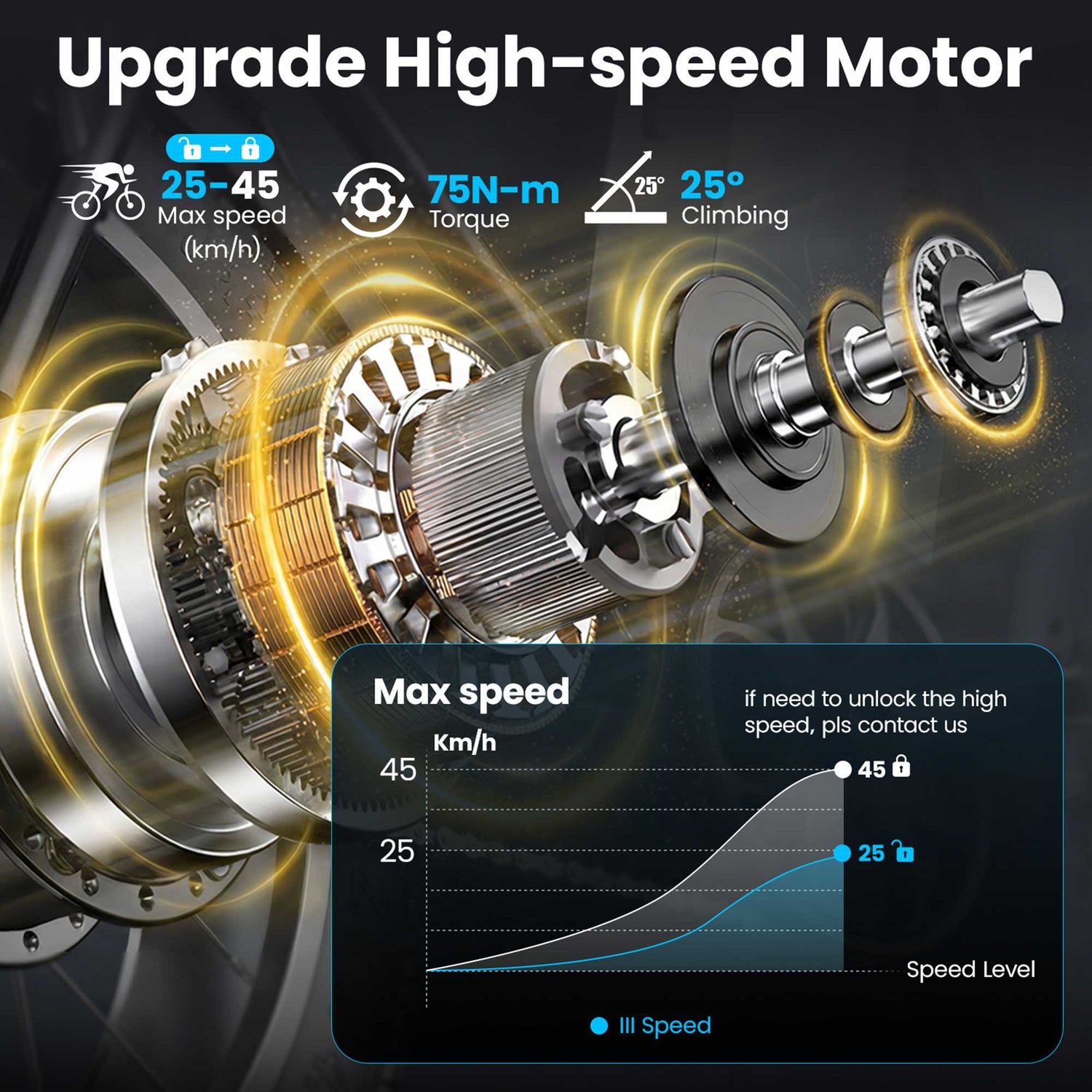 • Max Speed: 45 km/h (Unlocked) / 25 km/h (Default)