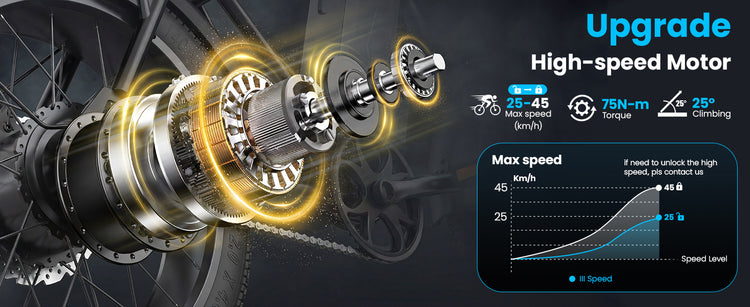 • 250W high-torque motor delivering 75 Nm of torque for effortless acceleration and confident hill climbing (handles up to 25° inclines).
