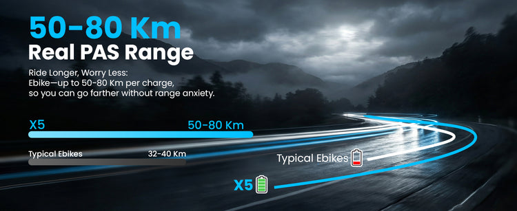 • Range: 50–80 km (Depends on terrain, load, and assist level)