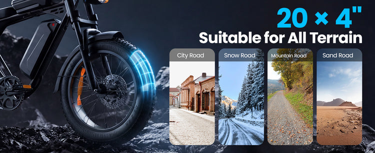 • 20" x 4.0" fat tires provide excellent grip and stability on pavement, gravel, and light trails.