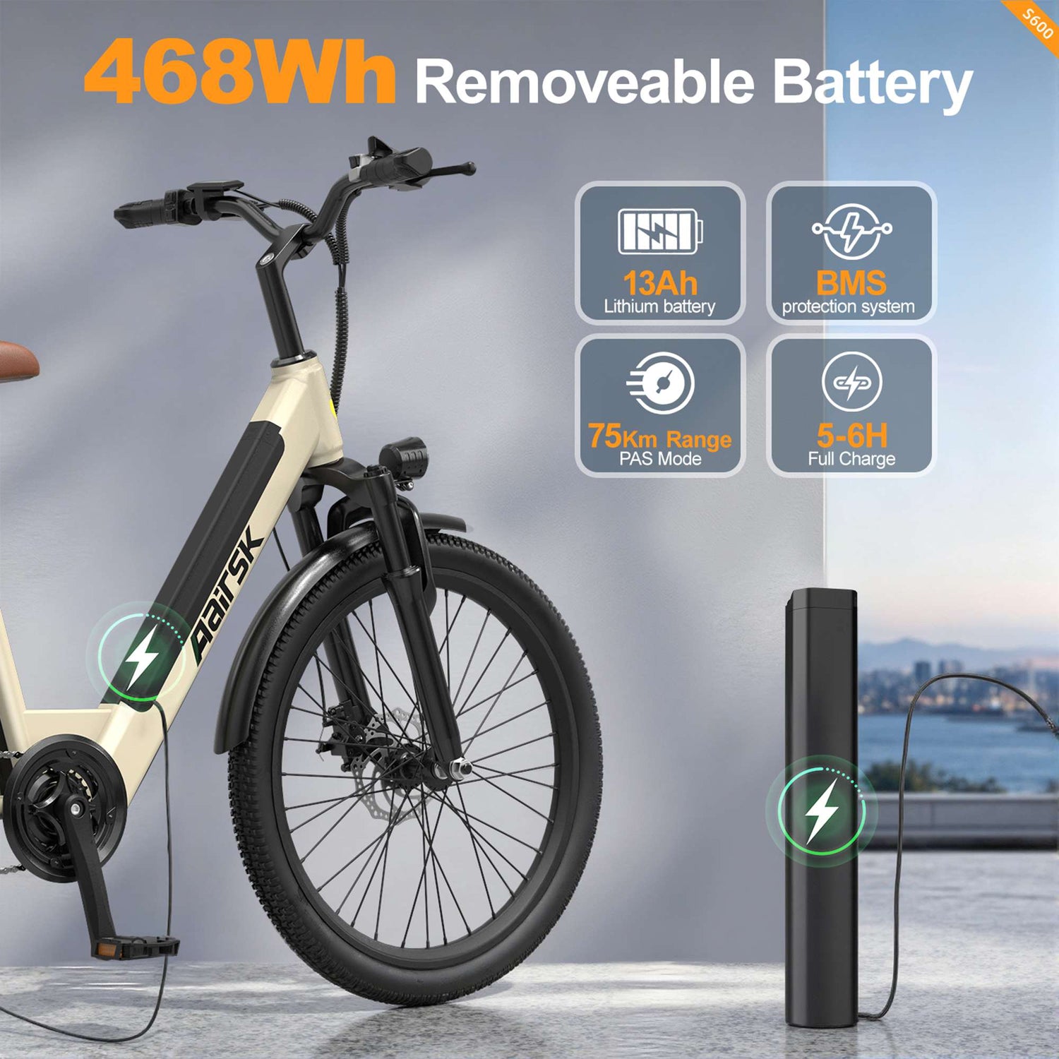 Enjoy reliable, extended rides with the high-capacity removable 36V 13Ah Lithium-Ion battery (468Wh). This efficient power source delivers up to 75 km on a single charge in Pedal Assist System (PAS) mode, perfect for daily commutes or weekend adventures. Recharge in just 4–5 hours, and take advantage of the battery’s easy-removal design for secure, convenient charging anywhere. The integrated IP65 waterproof housing ensures durability and a sleek look.